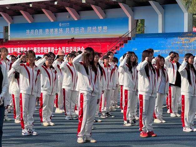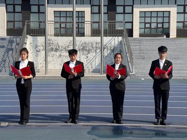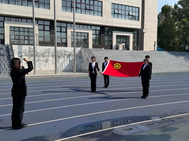 晨光熹微中,护旗手步伐坚定、神情肃穆地护送国旗走向升旗台。在激昂的国歌声中,文学院师生全体肃立,面向国旗行注目礼,五星红旗冉冉升起、高高飘扬在校园上空。