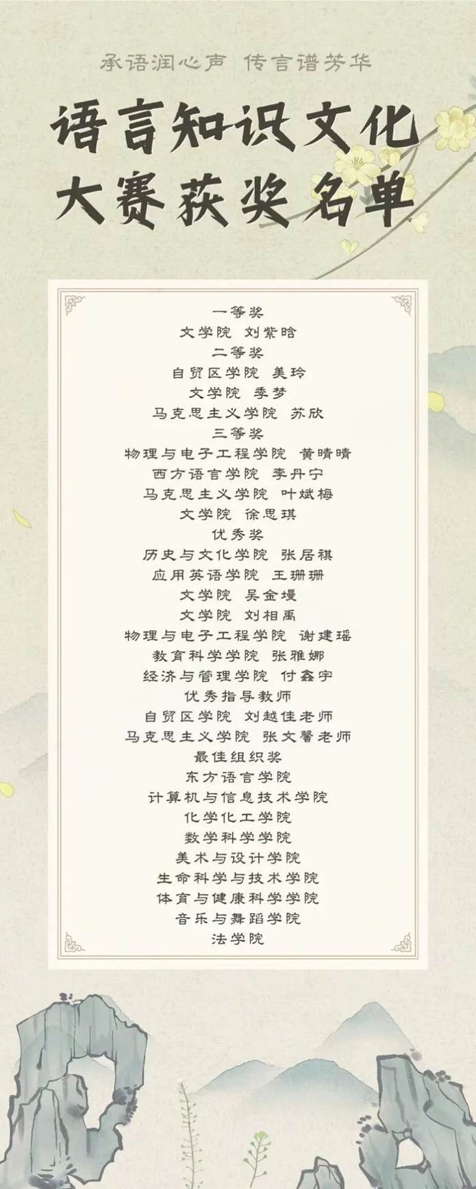 “盖文字者,经艺之本,王政之始,前人所以垂后,后人所以识古”。文字穿越千年而来,是汉民族几千年文化的瑰宝,也是我们终生的良师益友,每个人的精神家园。本次语言文字知识大赛,提高了同学们的语言文字规范意识和应用能力,为加强学习国家通用语言文字做出了应有的贡献!