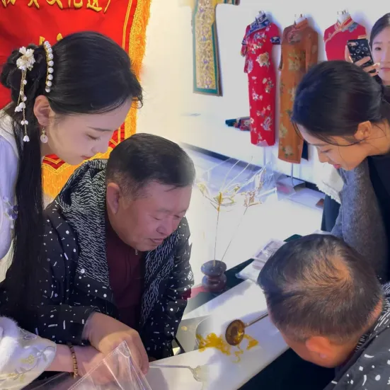 同学们分批次参观了非遗馆的“匠心技艺”“地域民俗”等展厅,重点体验了宁古塔泥塑、关东剪纸、满族刺绣(如渤海靺鞨绣)、木雕、糖画等非遗项目。在非遗传承人的指导下,同学们动手制作了糖画等作品,并学习了传统技艺的制作流程。