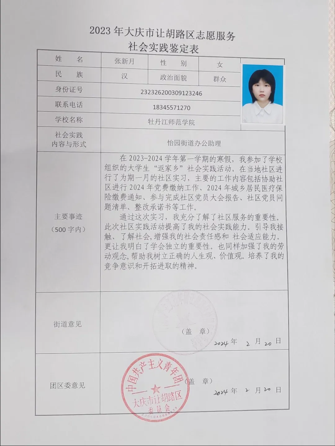 实践心得:寒假期间我参加了大学生“返家乡”社会实践活动,在当地社区进行了为期一月的社区实习,主要的工作内容包括协助社区进行2024年党费缴纳工作、2024年城乡居民医疗保险缴费通知、参与完成社区党员大会报告、社区党员问题清单、整改承诺书等工作。通过这次实习,我充分了解了社区服务的重要性。此次社区实践活动提高了我的社会实践能力。引导我接触、了解社会,增强我的社会责任感和社会适应能力。更让我明白了学会独立的重要性。也同样加强了我的劳动观念,帮助我树立正确的人生观、价值观。培养了我的竞争意识和开拓进取的精神。