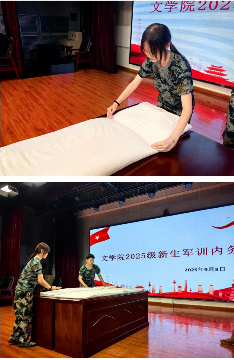 军训教官现场演示内务标准“豆腐块”被子的叠放技巧,系统讲解“叠、压、捋、捏”四大要领,对物品摆放、铺面整理、清洁标准提出统一要求,树立规范整洁的内务标杆。