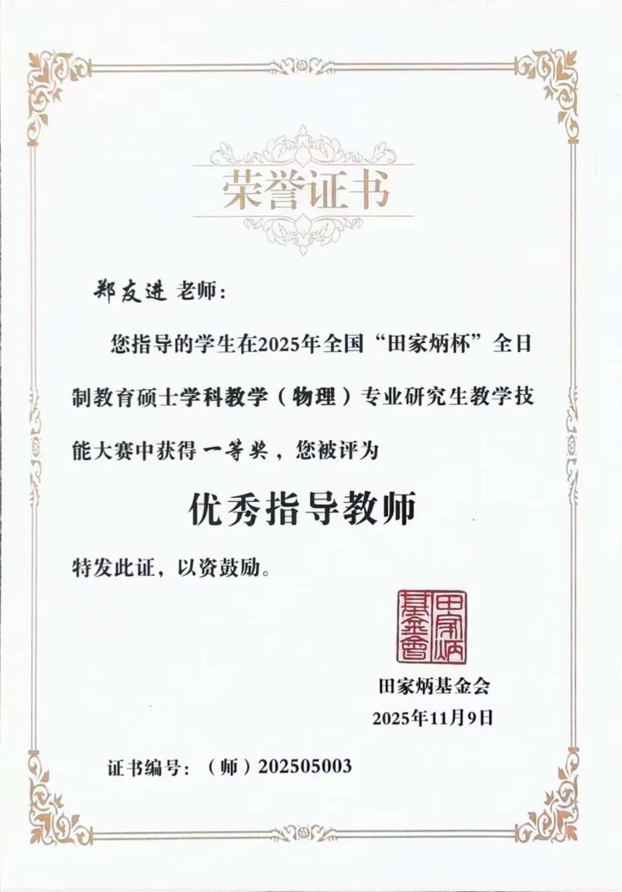 近日,2025年全国“田家炳杯”全日制教育硕士专业学位学科教学(物理)专业研究生教学技能大赛决赛暨全国学科教学(物理)专业研究生人才培养研讨会在华南师范大学圆满落下帷幕。我校2024级学科教学(物理)专业研究生崔炜烨在左桂鸿老师的带领下,凭借着扎实的专业功底、创新的教学设计和出色的临场表现,从众多优秀选手中脱颖而出,荣获大赛一等奖;郑友进老师荣获“优秀指导教师奖”。