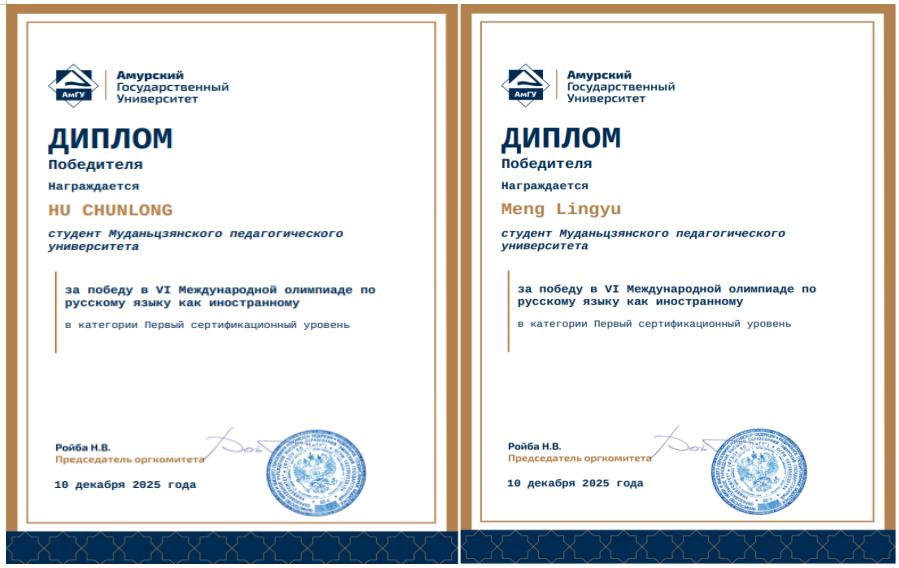 近日,俄罗斯阿穆尔国立大学对外俄语奥林匹克竞赛圆满结束。我校东方语言学院2023级学生胡春龙、孟令宇凭借扎实的语言基本功和出色的临场发挥,在众多参赛选手中脱颖而出,喜获竞赛第一级级别组冠军,并成功获得了申报2026-2027学年免费赴俄罗斯高校攻读硕士学位项目的资格。