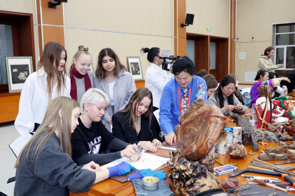 张艳霞在会上致辞。她代表学校向远道而来的留学生、全省各地的非遗传承人致以最热烈的欢迎,介绍了学校留学生教育的发展成果与非物质文化遗产教育研究基地的建设情况,着重强调文化交流是促进文明互鉴的重要纽带。同时,她寄语留学生以牡丹江师范学院“文化大使”的身份,用开放心态体悟中国文化的深厚底蕴,以创新思维探索传统与现代的结合。