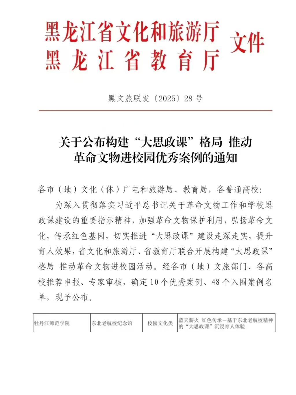 为深入贯彻落实习近平总书记关于革命文物工作和学校思政课建设的重要指示精神,加强革命文物保护利用,弘扬革命文化,传承红色基因,切实推进“大思政课”建设走深走实,提升育人效果,省文化和旅游厅、省教育厅联合开展构建“大思政课’格局推动革命文物进校园活动。经各市(地)文旅部门、各高校推荐申报、专家审核,确定10个优秀案例、48个入围案例名单。活动中,我院报送的《蓝天薪火 红色传承——基于东北老航校精神的“大思政课”沉浸育人体验》获批黑龙江省“构建‘大思政课’格局 推动革命文物进校园”入围案例。