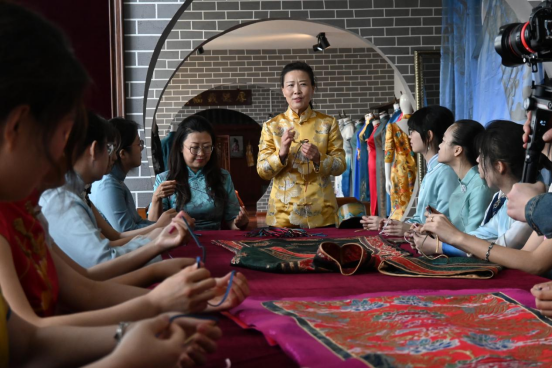 仪式结束后,参会人员共同观看了我校非遗基地近两年主办的黑龙江省社科普及活动成果展示视频,并实地参观满族旗袍展览馆,沉浸式体验满族旗袍盘扣传统制作技艺,近距离感受非遗的独特魅力。