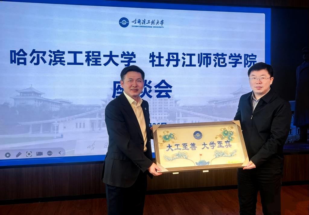 会后,学校向哈尔滨工程大学赠送由学生手工制作的带有哈尔滨工程大学校训的绒花牌匾。