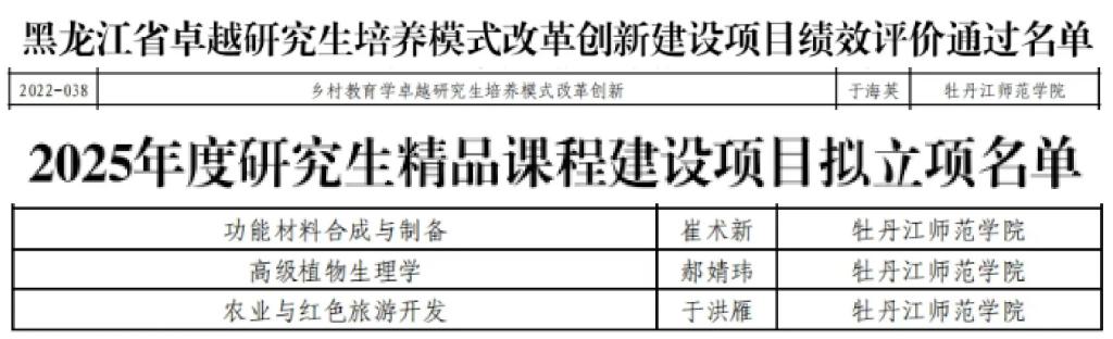 近日,黑龙江省教育厅公布了2025年度省级研究生精品课程建设项目的立项名单。我校共有三门研究生课程成功入选,获批数量再上新台阶。同时,在2025年度黑龙江省卓越研究生培养模式改革创新建设项目的绩效评价工作中,我校承担的榜单项目顺利通过考核,充分展示了我校在研究生教育改革与培养模式创新方面的扎实成效与持续突破。